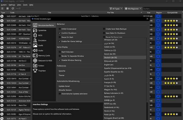 Zwei Änderungen sind mir bei PCSX2 aufgefallen. Ich spiele ja gerade Persona 3 FES damit und nutze dabei die Save-State-Funktion. Das ist gerade beim Laden meines Speicherstands sehr praktisch: Ich lade das Spiel, danach gleich meinen Save State und fertig. Es gab bloß ein kleines Päuschen am Anfang, wenn PCSX2 das BIOS initialisierte. Jene Pause fällt jetzt weg. Die zweite Änderung: PCSX2 unterstützt jetzt Sprachdateien - endlich!
